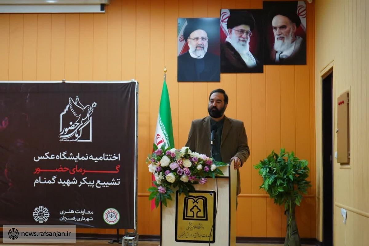 بهگزارش پایگاه اطلاعرسانی شهرداری رفسنجان، سیدمحسن سجادی صبح امروز در اختتامیه نمایشگاه عکس «گرمای حضور» تشییع پیکر مطهر شهید گمنام رفسنجان اظهار کرد: روزهای نخست که از حضور شهید گمنام در شهرستان صحبت شد جرقه عکاسی از این مراسم در ذهن بنده روشن و در معاونت هنری چارچوبی برای آن چیده شد.