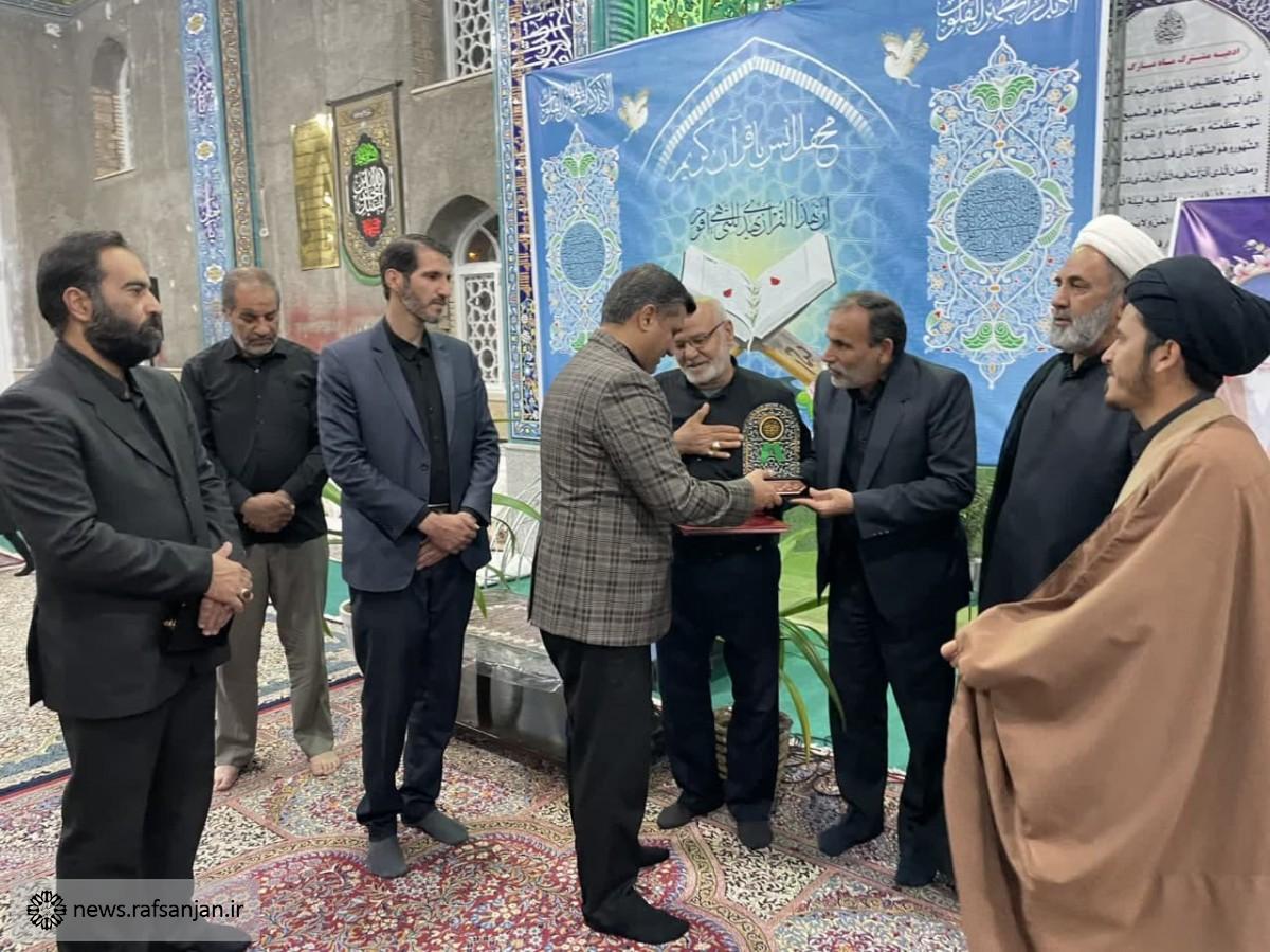 در این مراسم نشان شهروند افتخاری رفسنجان به قاری بین المللی استاد حاج امین پویا به پاس زحمات هفت ساله در راستای آموزش و ارتقاء سطح قاریان شهرستان تقدیم شد.