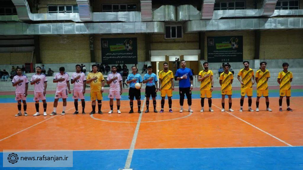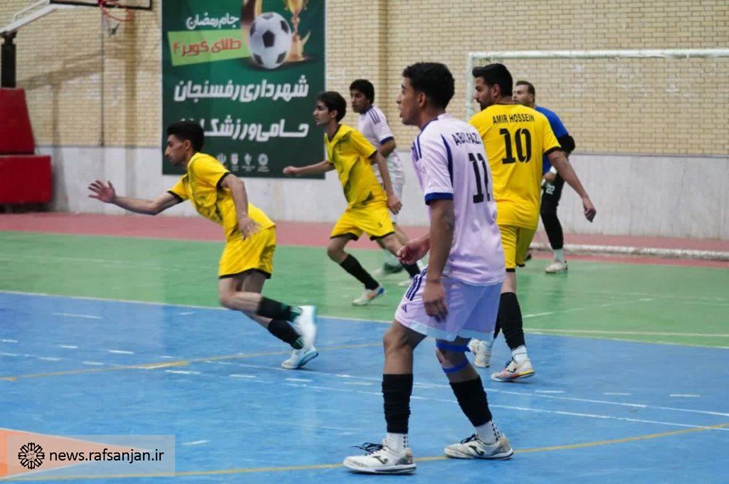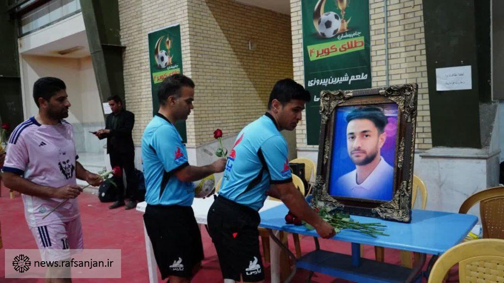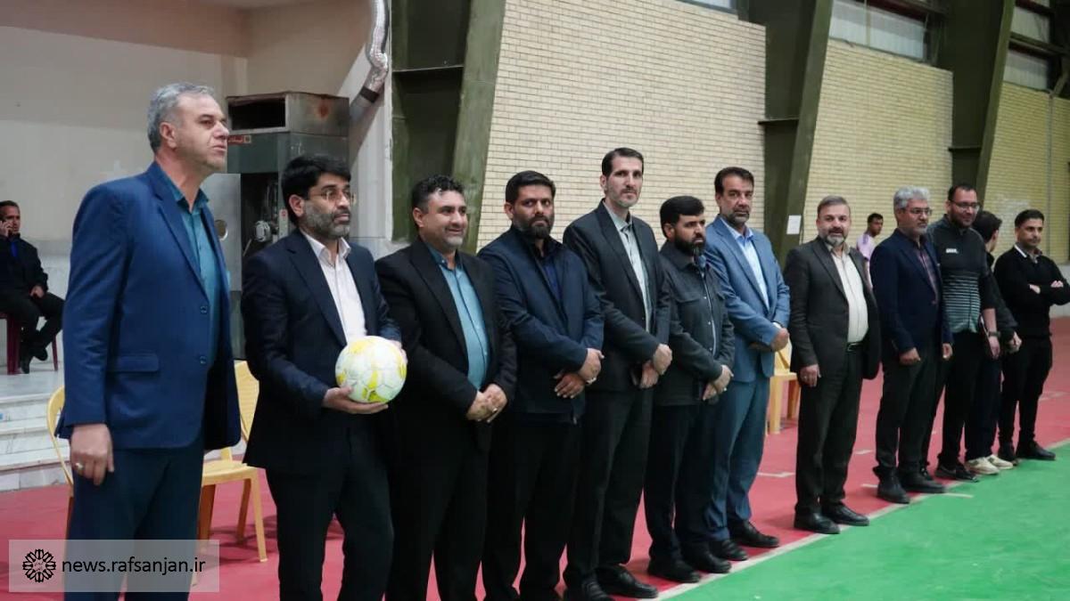 به گزارش پایگاه اطلاع رسانی شهرداری رفسنجان، آیین افتتاحیه چهارمین دوره مسابقات جام رمضان فوتسال «طلای کویر» با حضور شهردار رفسنجان، اعضای شورای اسلامی شهر، جانشین سپاه رفسنجان، مدیرعامل باشگاه ورزشی شهرداری رفسنجان، رئیس هیات فوتبال رفسنجان و مسئول بسیج ورزشکاران در سالن ورزشی دانشگاه پیام نور رفسنجان برگزار شد.