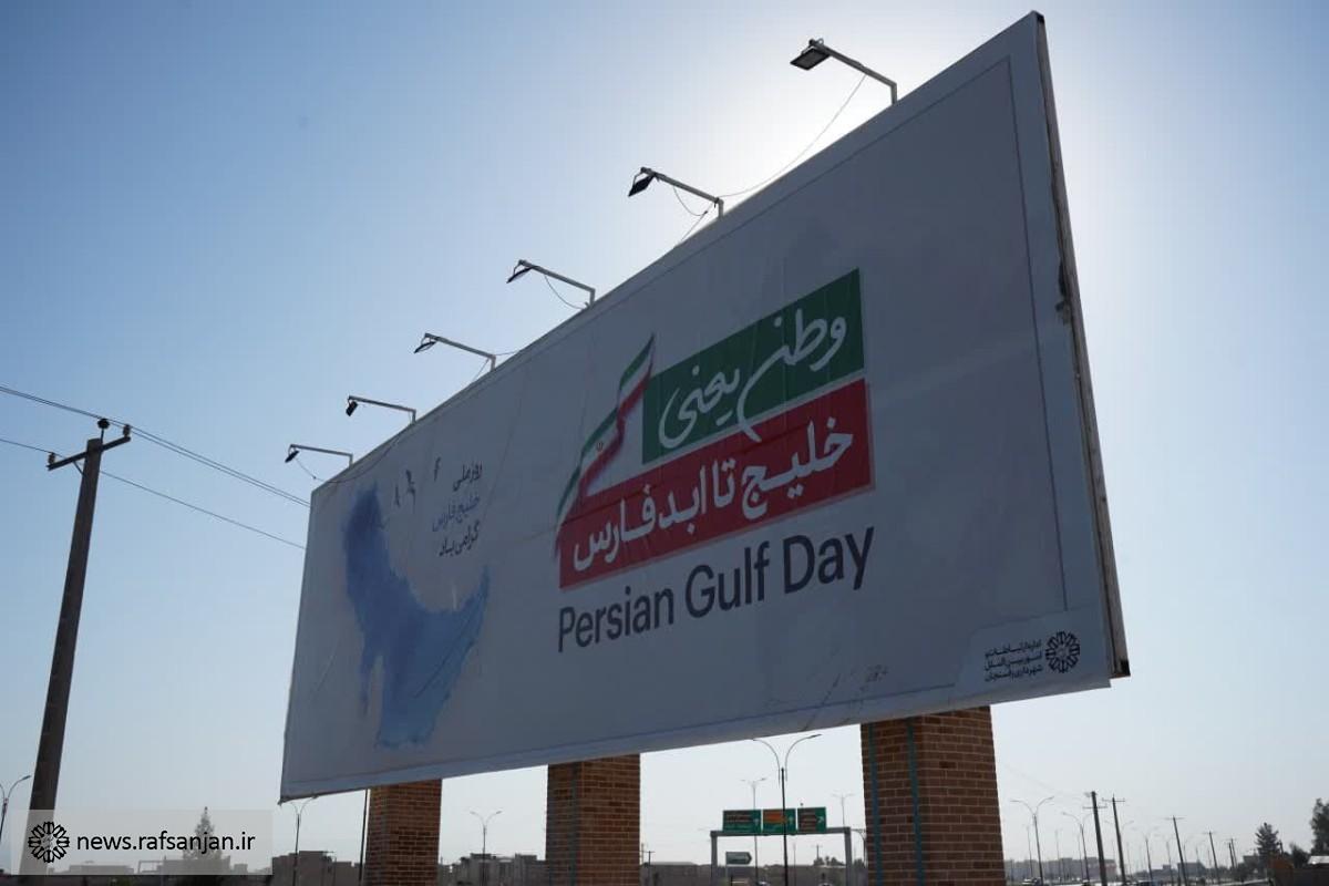 به گزارش پایگه اطلاع رسانی شهرداری رفسنجان، این بیلبورد با پیامهای “وطن یعنی خلیج تا ابد فارس” و تصاویری زیبا از این منطقه، نمادی از همبستگی و عشق مردم به هویت فرهنگی و تاریخی خود است.