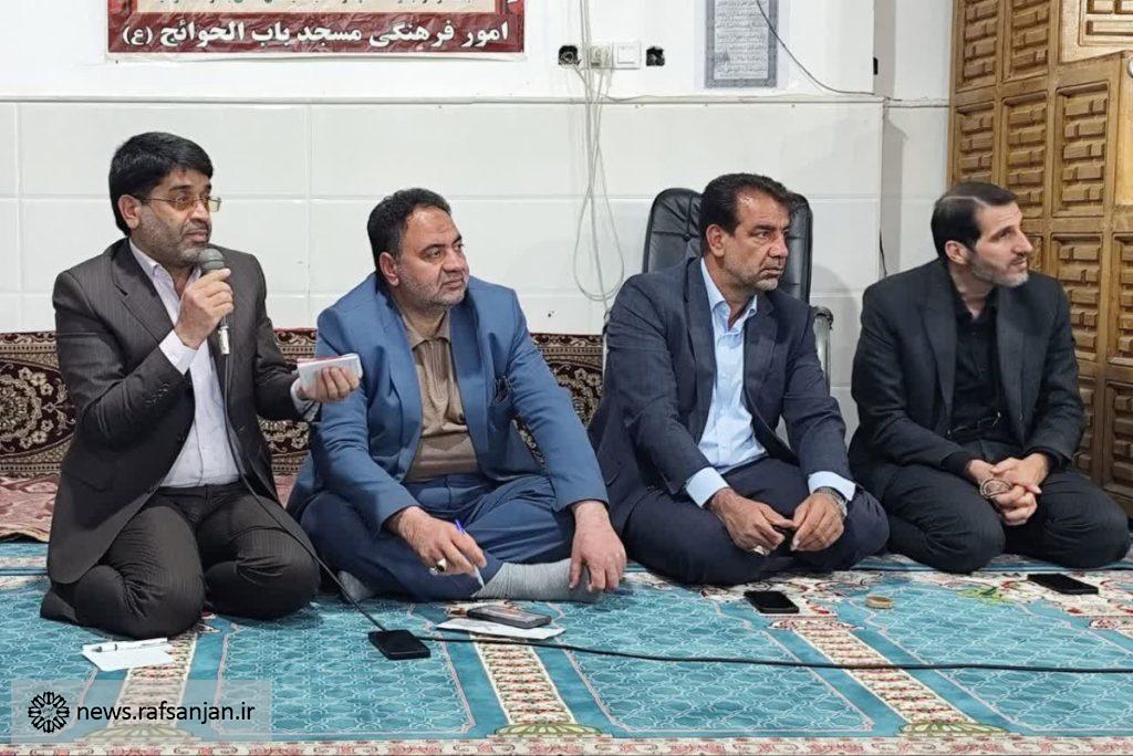 به گزارش پایگاه اطلاعرسانی شهرداری رفسنجان، شهردار رفسنجان به همراه رئیس و اعضای شورای اسلامی شهر با حضور در محله معراج شمالی و مسجد بابالحوائج، با اهالی این محله دیدار و گفتوگو کردند.