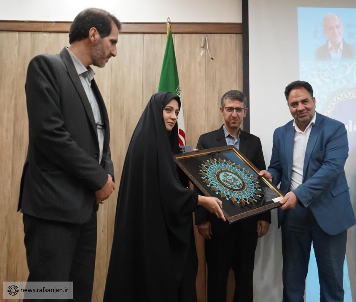 به گزارش پایگاه اطلاع رسانی شهرداری رفسنجان، در این جلسه که با حضور مسئول نهاد نمایندگی مقام معظم رهبری در دانشگاههای پیام نور استان کرمان، رئیس دانشگاه پیام نور استان، رئیس دانشگاه ولیعصر(عج)، اعضای شورای اسلامی شهر، شهردار و جمعی از مسئولان و اعضای هیئت علمی برگزار شد، از خدمات ارزشمند دکتر الهام صادقیراد در دوران مسئولیتش تجلیل به عمل آمد.