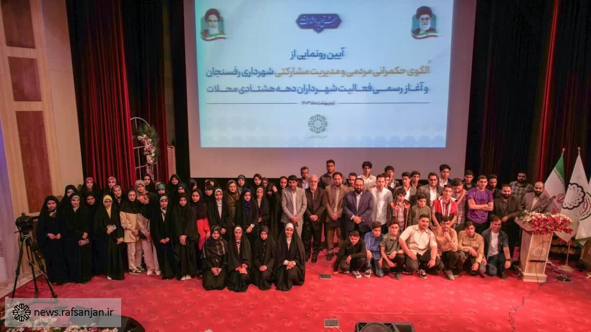 به گزارش پایگاه اطلاع رسانی شهرداری رفسنجان، آیین رونمایی از الگوی مدیریت مشارکتی و حکمرانی مردمی شهرداری رفسنجان و آغاز رسمی فعالیت شهرداران دهه هشتادی رفسنجان، با حضور، سیداحمد عبودتیان دستیار رئیس جمهور در امر مردمیسازی دولت، محمدمهدی فداکار استاندار کرمان، امام جمعه رفسنجان و جمعی از مسئولین شهرستان و نوجوانان دهه هشتادی در تالار خیام دانشگاه حضرت ولیعصر (عج) برگزار شد.