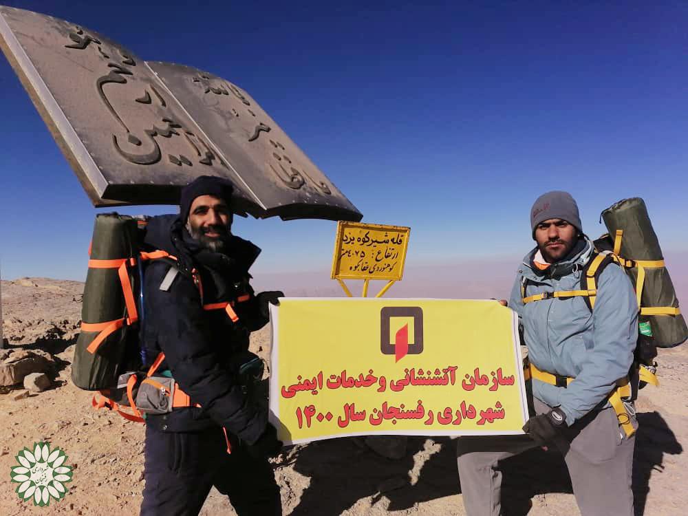 ?به گزارش روابط عمومی شهرداری وشورای اسلامی شهر رفسنجان آقایان #محمد_نصراللهی و #علی_حنیف نژاد دو پرسنل سازمان آتش نشانی وخدمات ایمنی شهرداری رفسنجان در آستانه آغاز امامت صاحب الزمان(عج) و هفته تربیت بدنی به قله ۴ هزار و ۷۵ متری شیرکوه یزد بلندترین قله استان یزدصعود کردند.