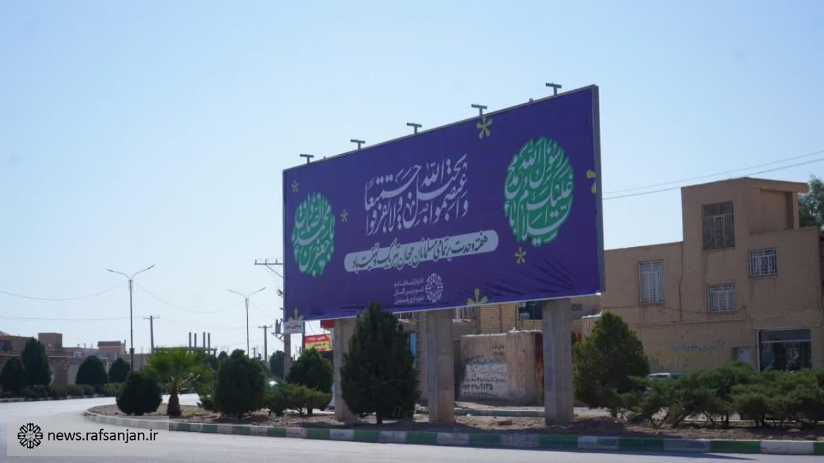 به همت اداره ارتباطات و امور بین الملل شهرداری رفسنجان طرح های فرهنگی هفته وحدت در فضای شهر اکران شد.
