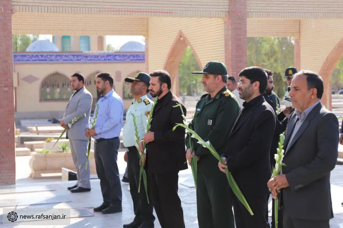به گزارش پایگاه اطلاع رسانی شهرداری رفسنجان، به مناسبت هفته دولت مهندس رضایی فرماندار، رئیس و اعضای شورای اسلامی شهر، شهردار و مدیران این شهرستان با حضور در گلزار شهدای رفسنجان با آرمان های شهیدان تجدید پیمان کردند.