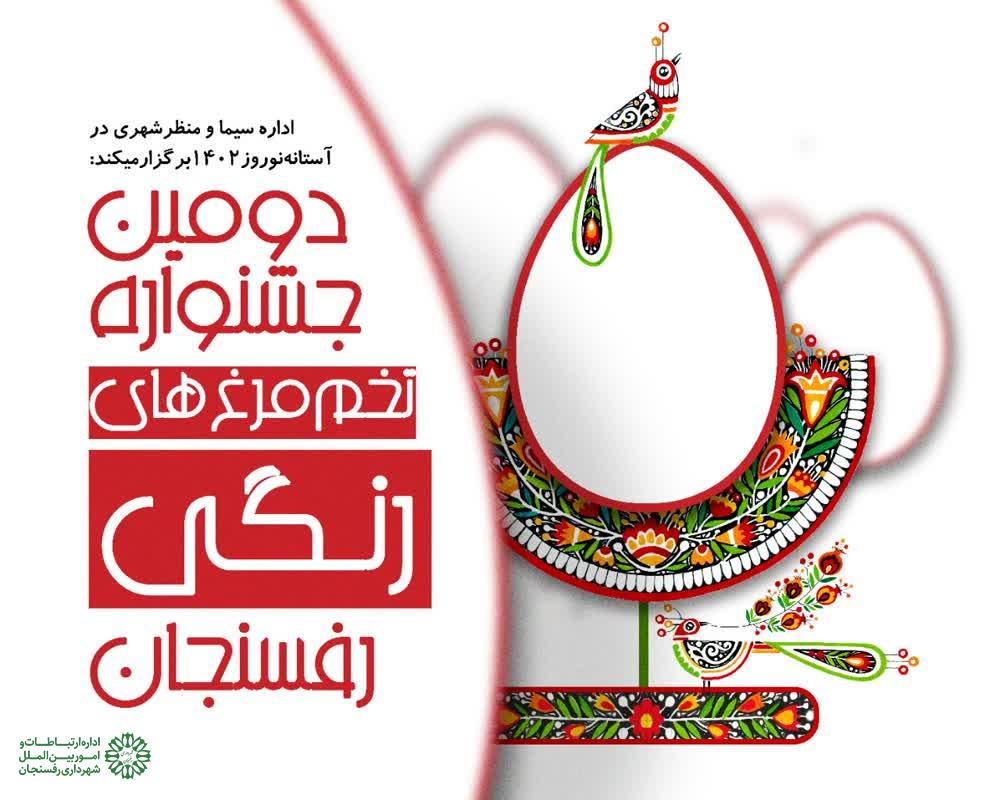 اداره سیما و منظر شهرداری رفسنجان با هدف نمایش نمادهای فرهنگی و هنری در برگزاری آیین های نوروزی، دومین جشنواره تخممرغهای رنگی را در آستانه بهار ۱۴٠۲ با هدف ارتقاء سطح کیفی فضای شهری و ایجاد حس شور و نشاط بهاری برگزار می کند.