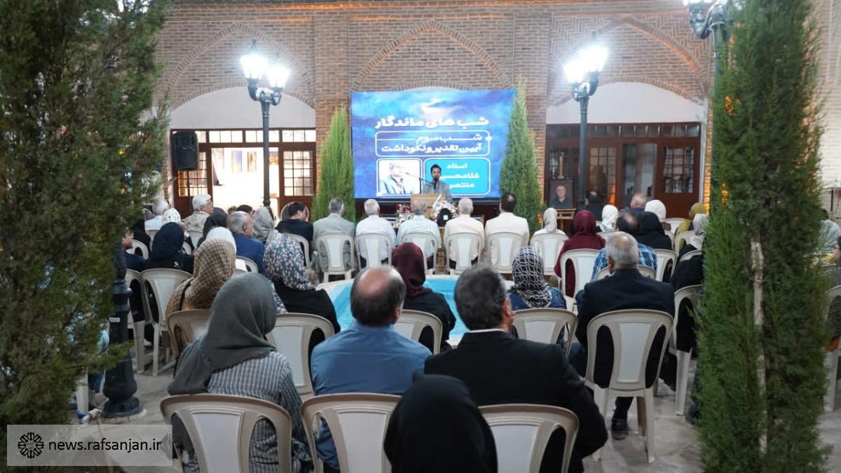 گفتنی است، ویژه برنامه شب های ماندگار به همت معاونت هنری شهرداری رفسنجان و به منظور تجلیل از مقام هنرمندان و اساتید برجسته و پیشکسوت در تیمچه معین برپا می شود.