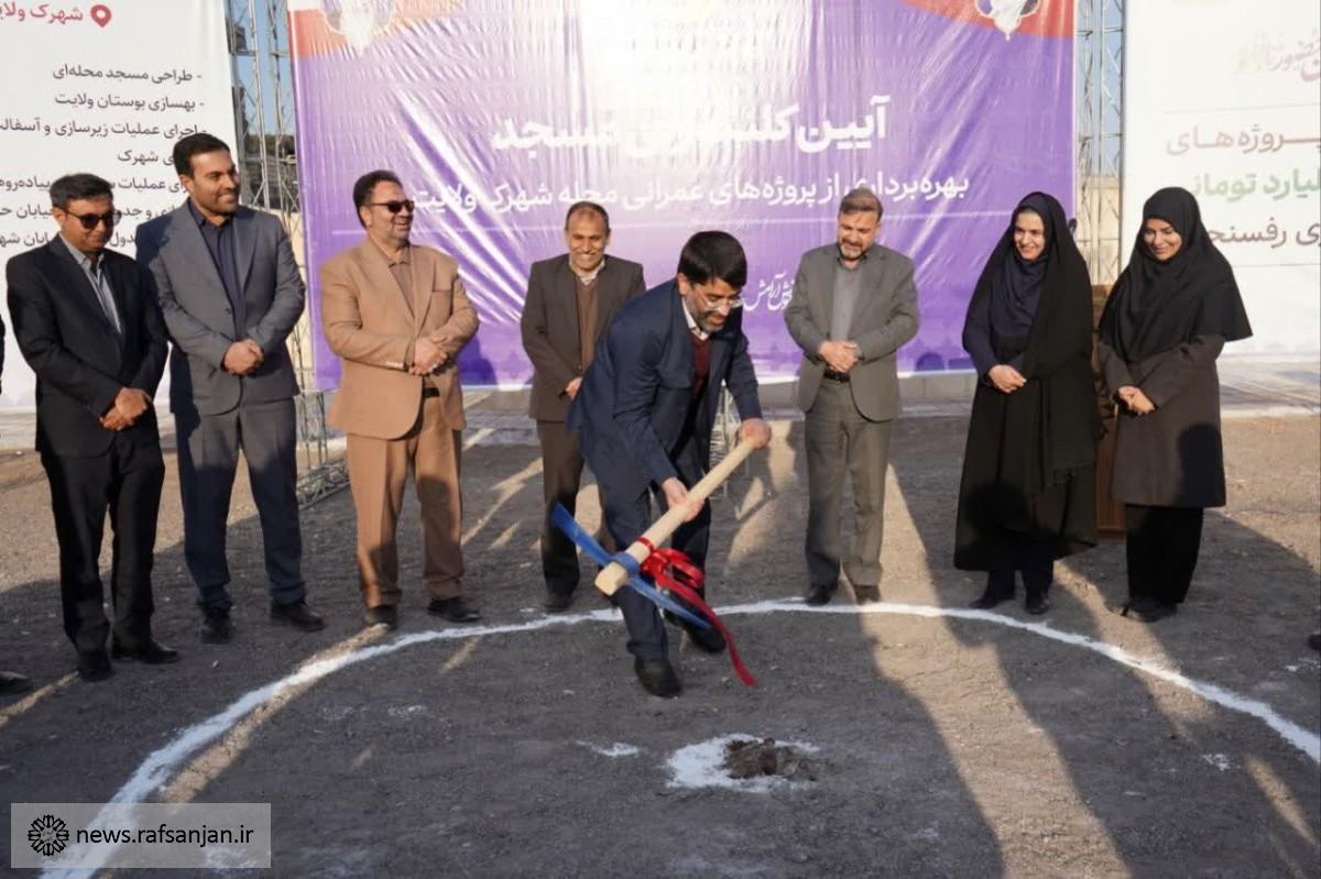 به گزارش پایگاه اطلاع رسانی شهرداری رفسنجان، آیین کلنگ زنی مسجد محله شهرک ولایت با حضور فرماندار، شهردار، رئیس و اعضای شورای شهر، جمعی از معاونین شهرداری و مسئولین برگزار شد.